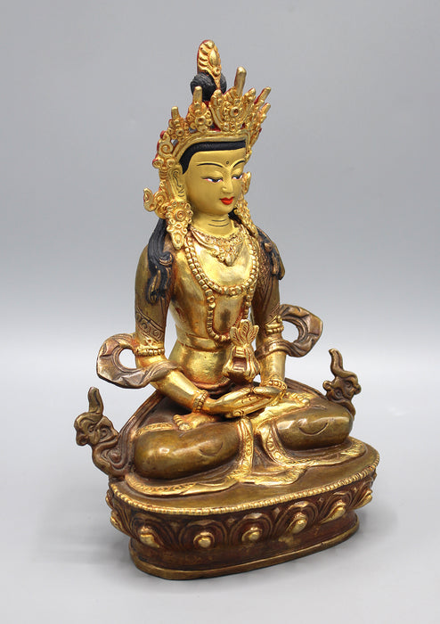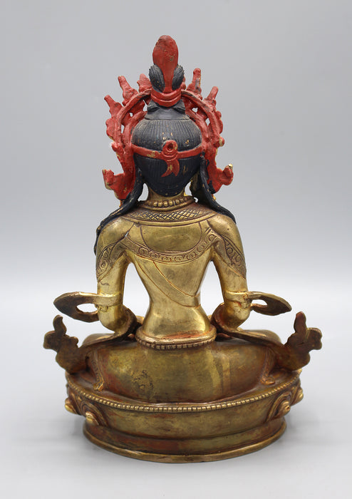 Made by a fourth generation sculptor, this gold plated Aparmita Buddha statue is 8.7 inches tall and features fine carvings and details. Aparmita Buddha is seated in a lotus pedestal in Dhyana Asana or meditative pose with a vase in his hands.