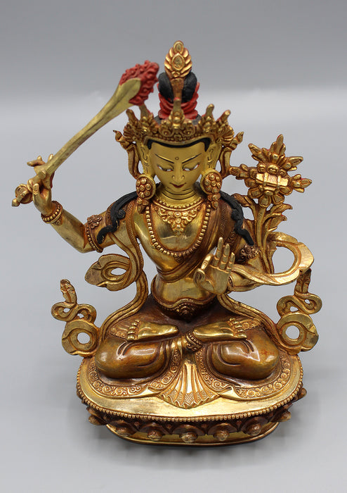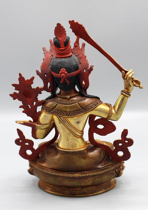 This is a Partly Gold Plated 8.5 Inches High Copper Manjushri Statue. The statue is handmade in a traditional way employing lost wax technique. The artist who made this statue is now a forth generation statue maker and is extremely talented which can be seen in the fine, intricate and smooth details of the statue.