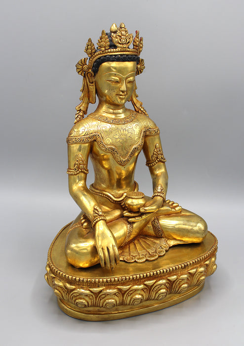 This is a 13 inch high fully gold plated copper statue of Shakyamuni Buddha. The floral motifs on the robe of shakyamuni Buddha is carved with each details perfectly. Buddha is wearing a crown wearing a detailed carved monastic robe incised with floral motifs.