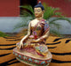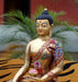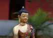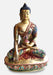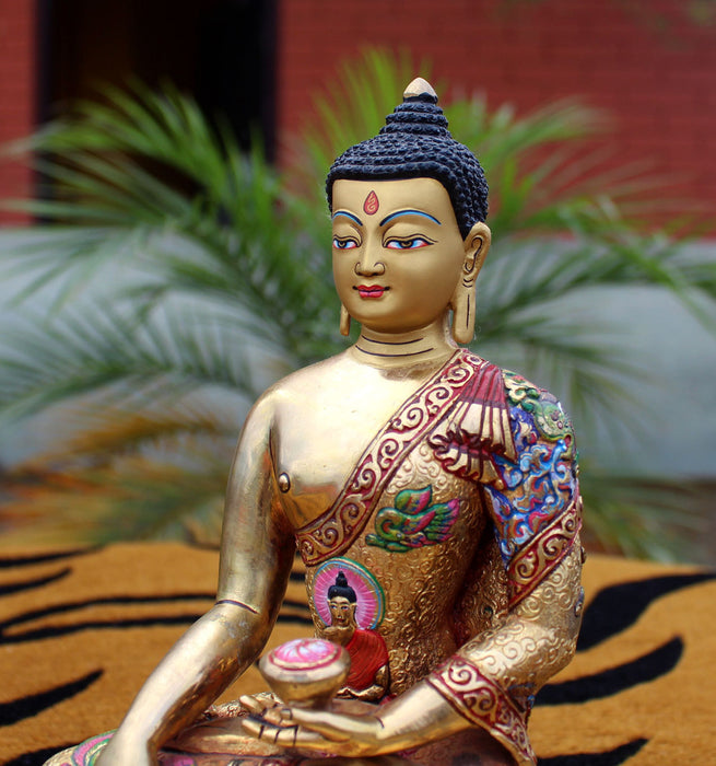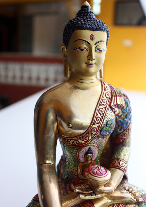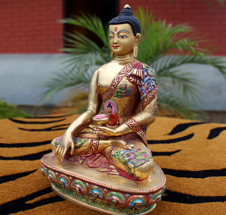 This is a monastic statue of Shakyamuni Buddha which has been fully gold plated and then handpainted on various aspects of the robe and the lotus.