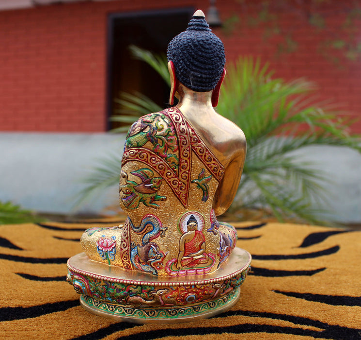 The statue has Amitabh Buddha carved on the front of the robe around the stomach area and then another Buddha carved at the back side on the robe around the back area. There are several carvings of dragons, birds, Garuda, floral motifs, tibetan auspicious symbols carved all around the monastic robe which Shakyamuni has worn gracefully.
