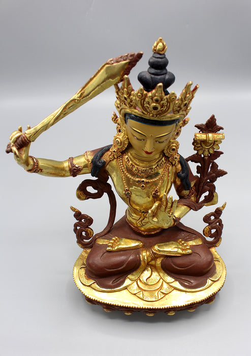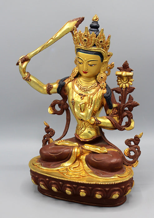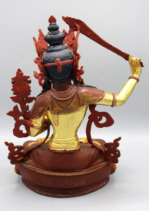 This is a partly Gold Plated 12.5 Inches High Copper Manjushri statue. The statue is handmade in a traditional way using a lost wax technique. The artist who made this statue is now a forth generation sculptor and is extremely talented which can be seen in the fine, intricate and smooth details of the statue.