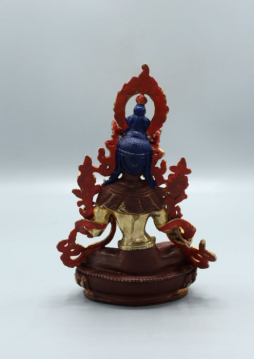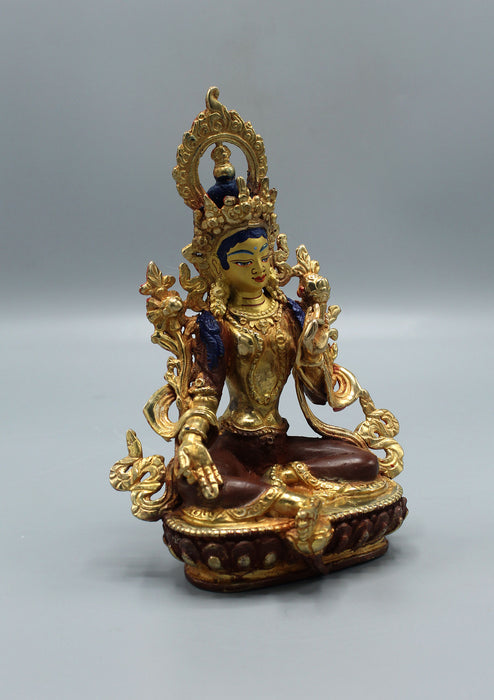 This is a gold plated 6.5 inch Green Tara Statue which is completely hand crafted in Nepal. Nepalese sculptures are popular around the world since they are made with genuine ancient techniques and with the expertise of skilled craftspeople. Our sculptor is a fourth generation artist whose family has been sculpting for over a century now.
