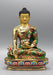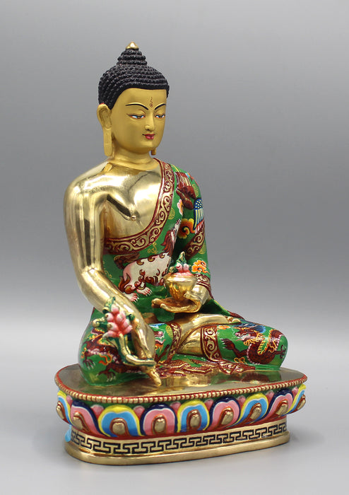 This is a 8.5" inch high gold plated copper statue of Medicine Buddha. The robe of Medicine Buddha has painted with red and green color flower pattern all over.