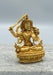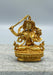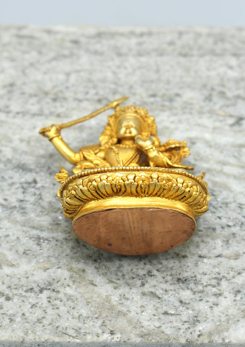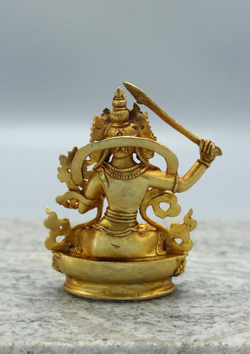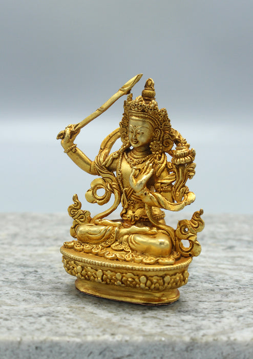 This is a gold plated 3.5 inch high Copper Statue of Manjushri. Manjushri is depicted as a male Bodhisattva wielding a flaming sword in his right hand, representing the realization of transcendent wisdom which cuts down ignorance and duality.