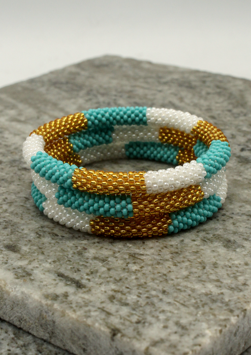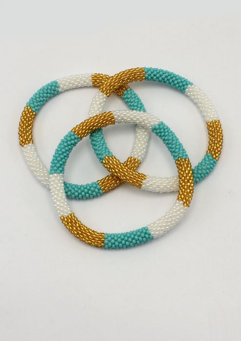 These fairly traded glass beads bracelet are meticulously crocheted by our women artists. Our woman artist carefully hand-strung these Roll On bracelet to give them the best shape and design.