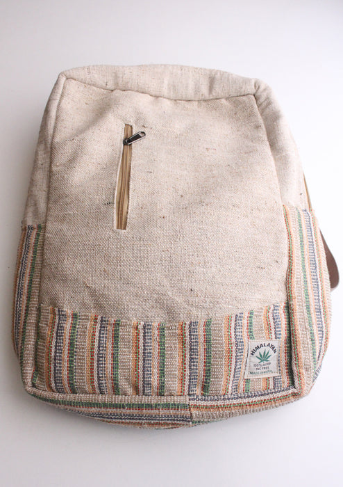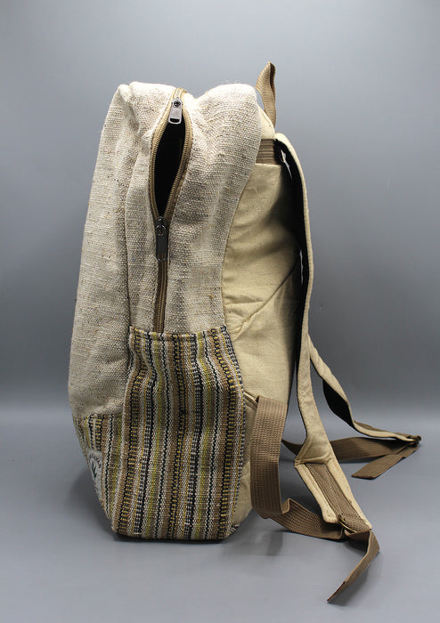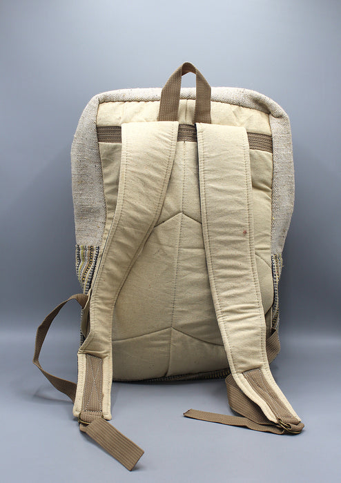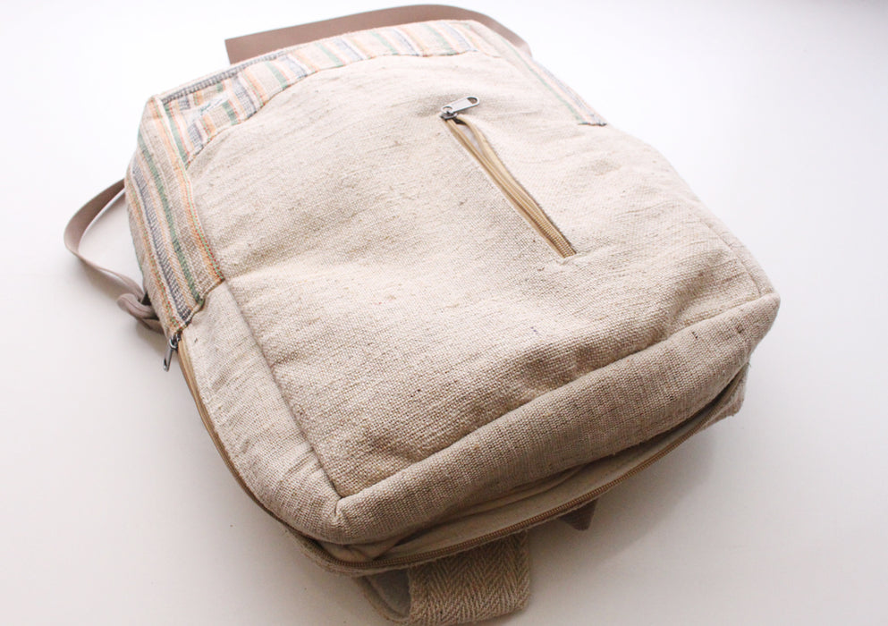 This backpack is made of Hemp, completely hand stitched in Nepal, this backpack has a natural and earthy look. It has many zipper pouches to store your books, clothes, ipads and literally anything that fits inside. This bag has also laptop sleeve to protect your laptop from scratch and dirt's. The back and front part of the bag also has compartment with zipper closure.