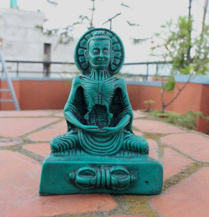 This is a beautifully handmade green emaciated Meditating Buddha resin statue. It is believed that on the path of attaining enlightenment, Buddha was deep into meditation and forgot the worldly sufferings which included hunger, pain, weakness, shivering and finally death. This statue represents Buddha in those final stages of enlightenment.