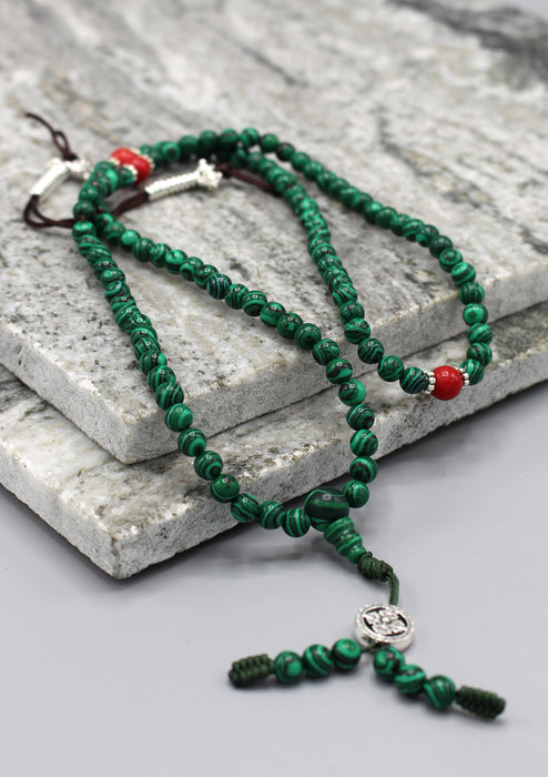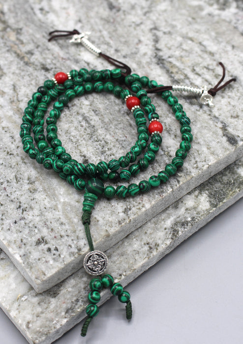 This is a very beautiful Malachite Beaded Prayer Mala with 108 beads of 6 mm. This mala has three coral beads counter along with two Taiwanese Counter attached to it. The Taiwanese counter can be used to count the recitations of mantras, prostrations or names of Buddha. It allows you to control your count so that you do not forget while in deep meditation or devotion.