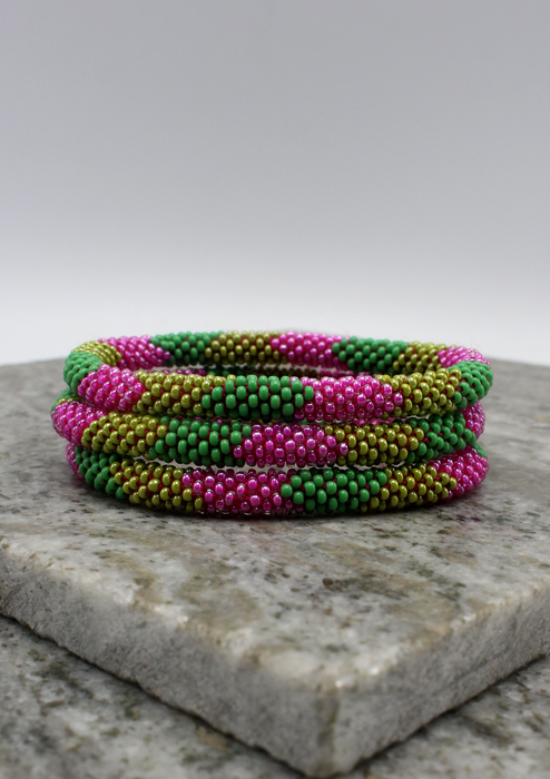 Green Pink Nepalese Roll On Bracelet has been meticulously crocheted by our women artists. Our women artists have carefully hand-strung this fairly traded Roll On bracelet.