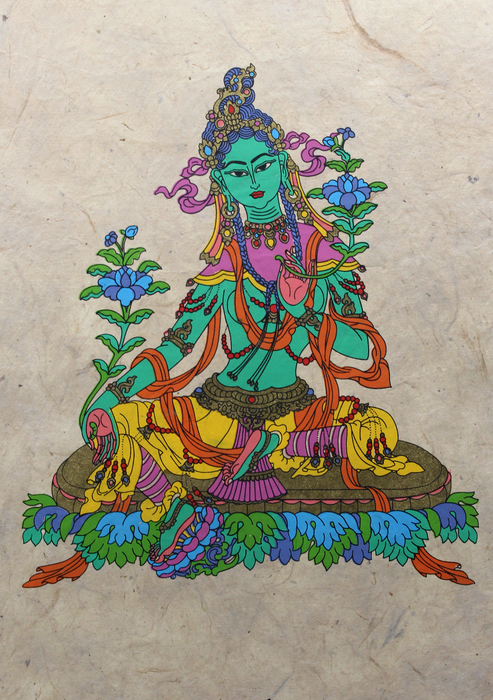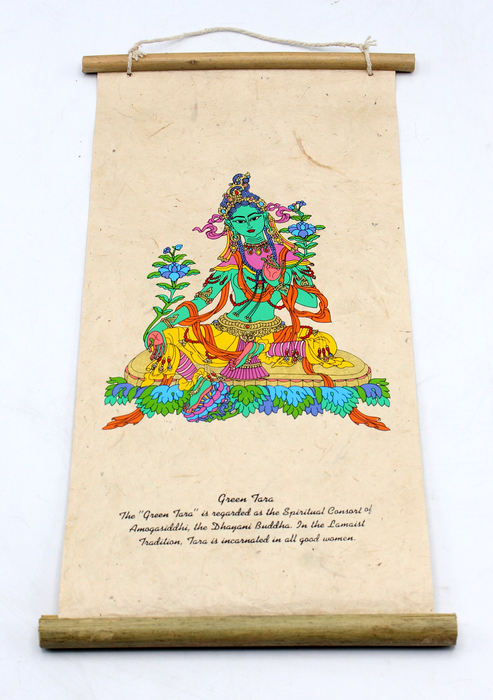 This is a beautiful wall hanging handmade in Nepal. The bright and colorful picture of Green Tara is printed in the Himalayan lokta paper. To give it a traditional and Nepalese look, Bamboo sticks are attached to both side of the wall hanging. Bamboo sticks also balance and hold the paper perfectly.