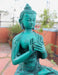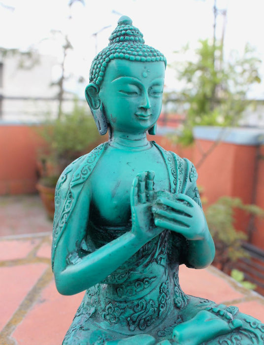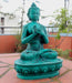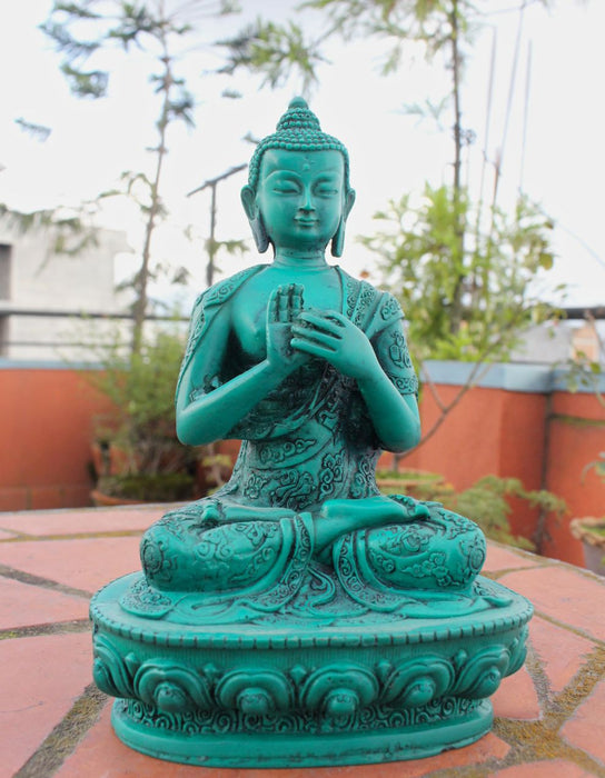 This is a beautifully handmade Turquoise toned Vairochana Buddha resin statue which has floral motifs all over the robe and dragon carving at the back side of the lotus. These are alternative and affordable statues which costs relatively lower than the expensive metal statues. These statues are made from as a replica of the original metal statues. The use of resin makes the statue much lighter and affordable. The only difference in these statues and metal statues are the use of materials. Apart from that, everything else is quite identical.