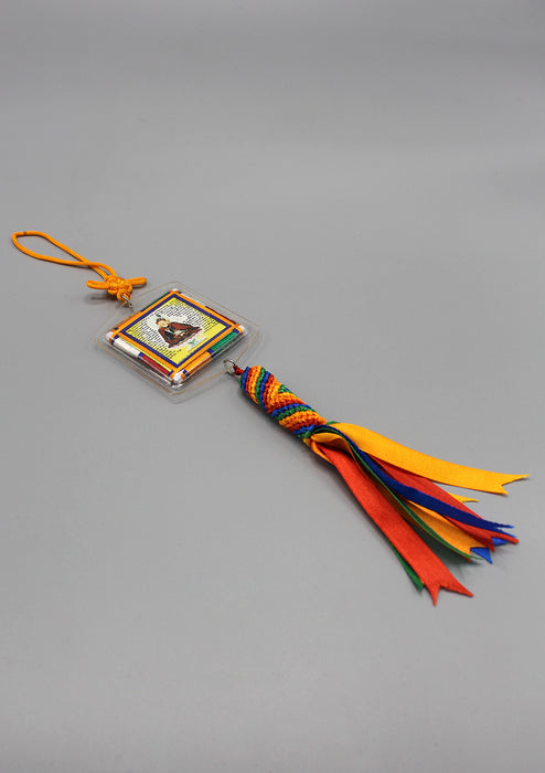 This is a Tibetan Guru Rinpoche amulet. This Tibetan amulet is specially made for achieving all good fortunes. This amulet hanging is to be hanged in the real view mirror. This amulet has Tibetan mantra above a paper folded into many folds and wrapped by the five element colors Red, Blue, White, Orange and Green nylon thread. The bottom part is colorful ribbons twined and crocheted to form a fat rope and then end up like tassel.