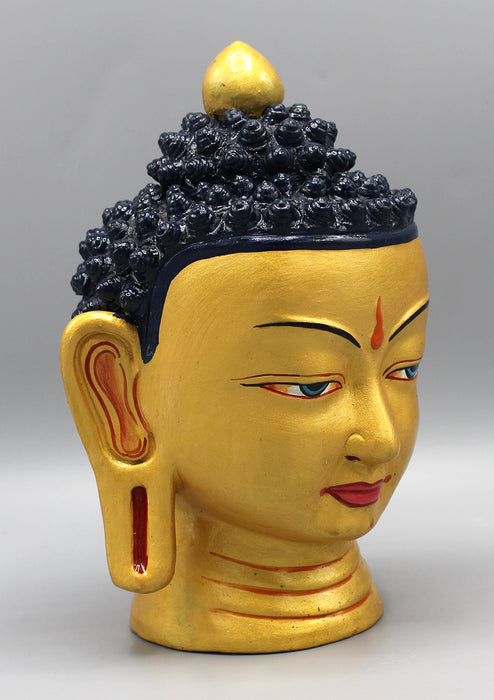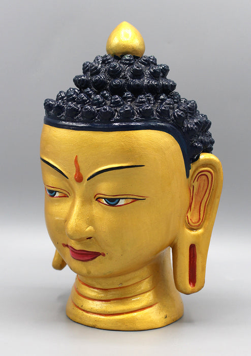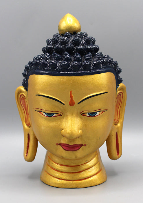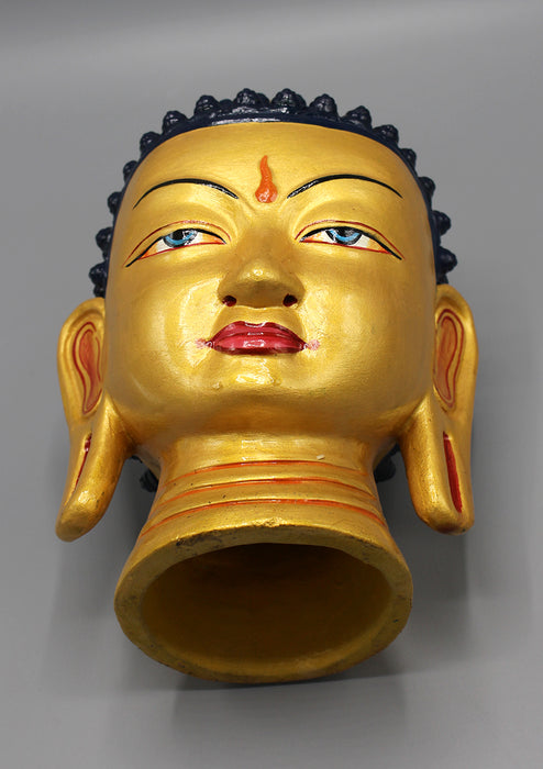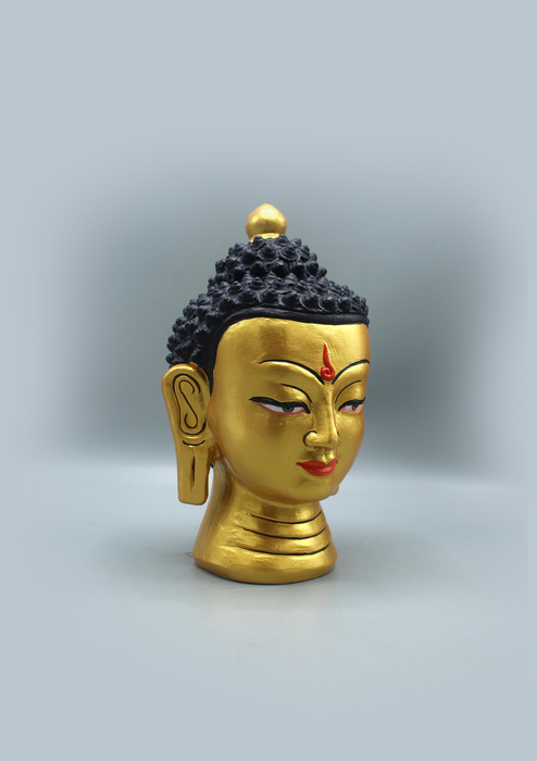 This is a beautiful hand painted Buddha head. The face of the Buddha is painted with golden color. A beautiful gleaming gold-glazed piece that has been delicately carved. This statue can be placed at your living room as a home decor. This Buddha head is made of clay.
