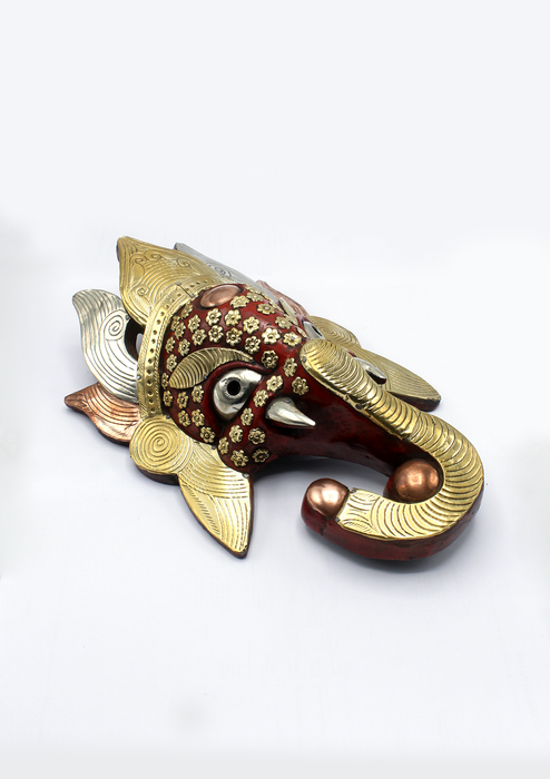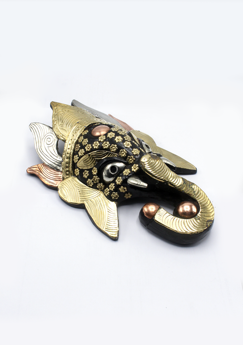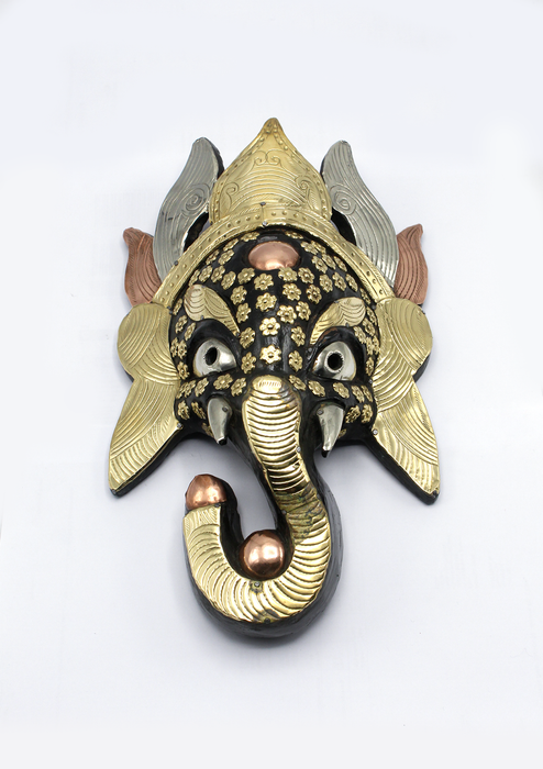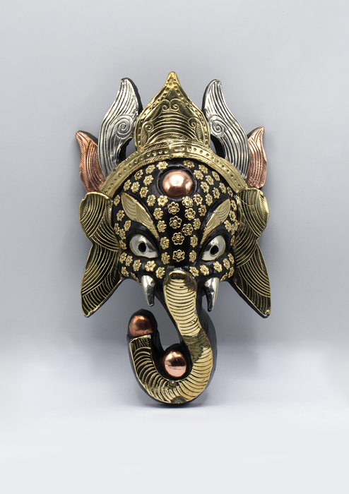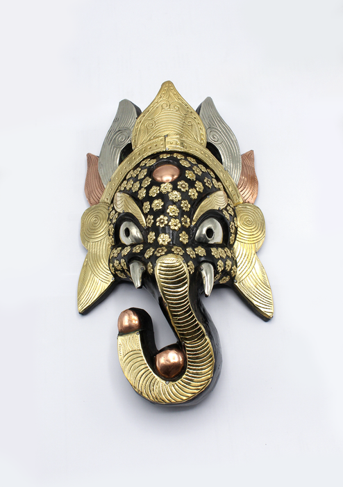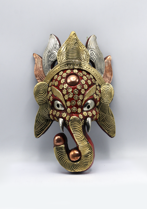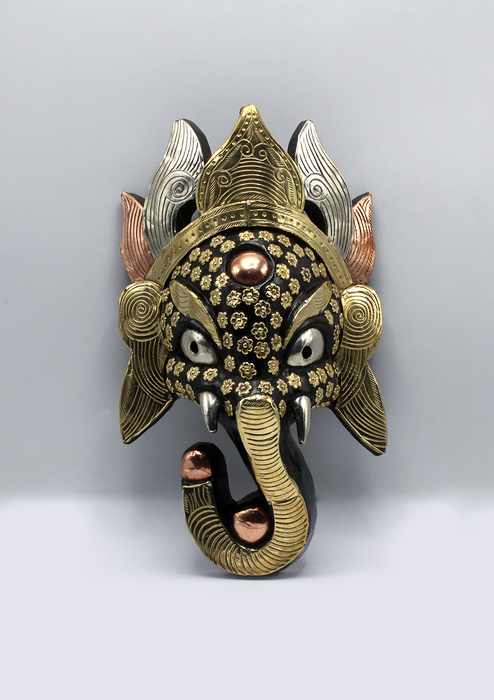 Behold this magnificent Lord Ganesha mask, a true testament to the craftsmanship of our skilled artisan from Changu Narayan. This exquisite handmade piece is adorned with intricate floral motifs and delicate golden embellishments, reflecting the artisan's mastery and dedication.
