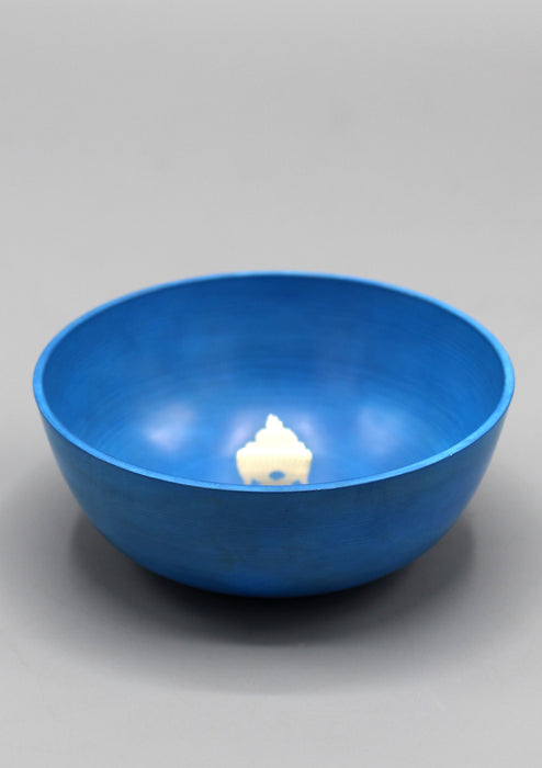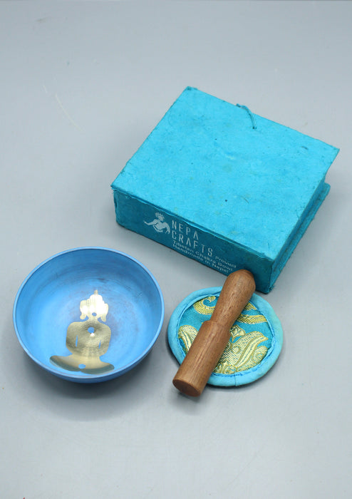 This is a beautifully hand painted singing bowl handmade in Nepal. Our Nepalese artist has painted the singing bowl in a blue color. In the center the singing bowl is painted with a meditating Buddha indicating seven chakra of human body.