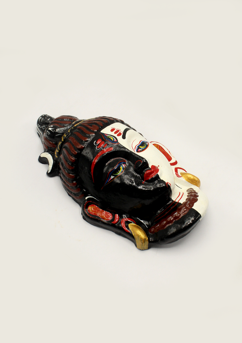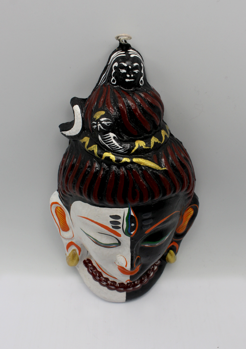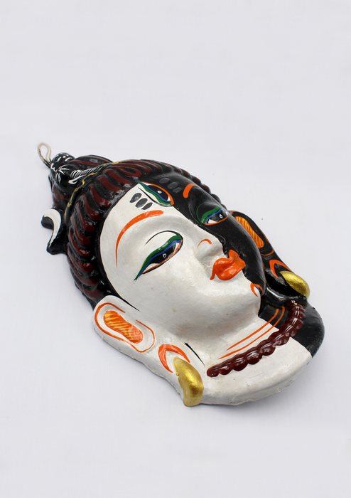This is a unique mask made of paper. The mask is given a shape of deities Shiva hand painted with different colors. The hard paper is used to make this wonderful mask.