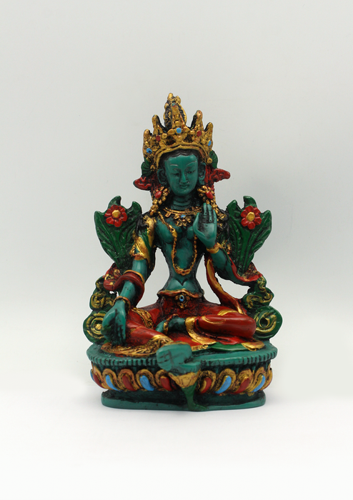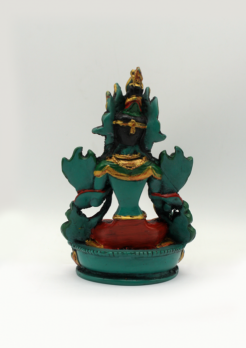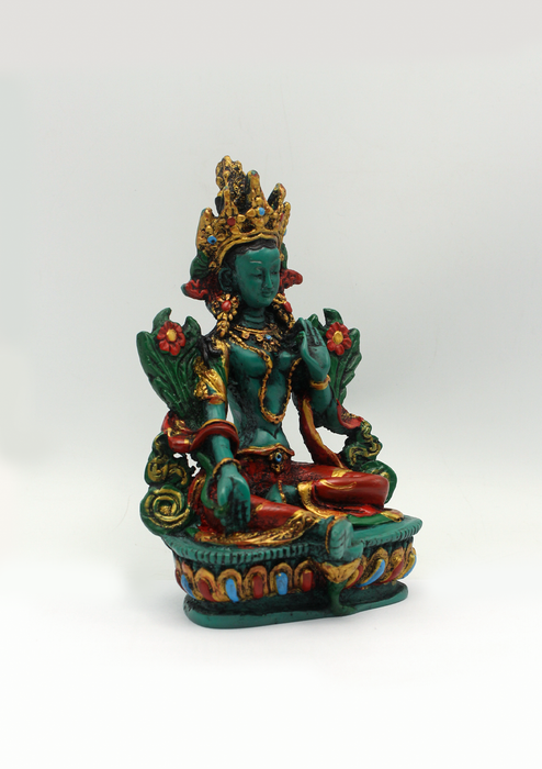 The hand-painted resin Green Tara statue is a beautifully crafted piece that embodies the essence of compassion and swift action. Its vibrant colors and intricate details bring the benevolent deity to life, making it a perfect addition to any spiritual space.