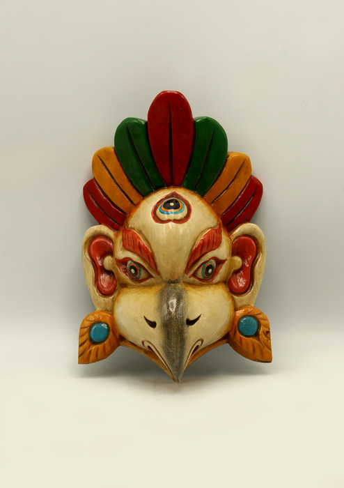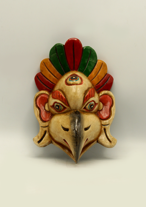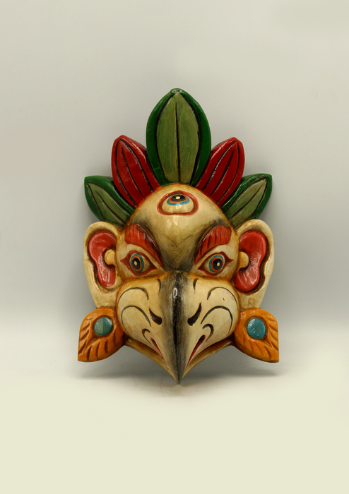 This is a beautifully handcarved wooden mask of Garud. This mask has been beautifully carved by our artisan from Changu Narayan. The mask has been made with great detail and has been painted in Red Color by our artisan.