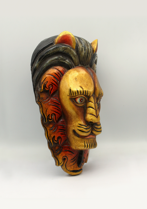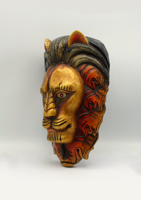 In various spiritual traditions, the lion is revered as a symbol of strength, courage, and protection. It is believed that the lion embodies the fierce and protective nature of Bodhisattva Avalokiteshvara, much like Bhairab. The lion is often seen as a guardian figure, warding off negative energies and safeguarding sacred spaces. This lion mask serves as a powerful reminder of the protective and courageous qualities that are invoked to overcome obstacles and challenges on the spiritual path.