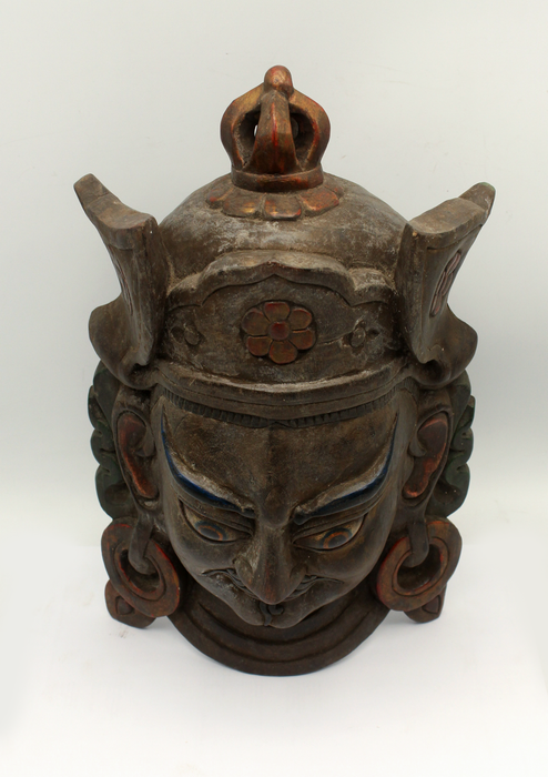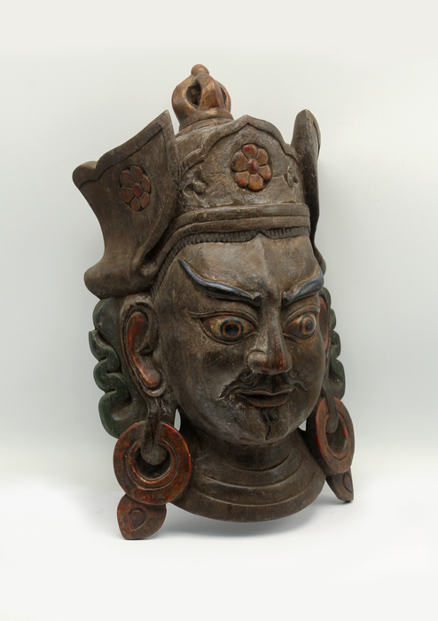 This distinctive mask showcases the face of Guru Rinpoche, also known as Padmasambhava. Expertly carved from solid wood, the mask captures every detail with precision. It serves as an exceptional piece of home decor, embodying both artistic craftsmanship and spiritual significance. Handcrafted by our skilled and experienced artisan, this wooden mask reflects the dedication and mastery of traditional techniques.