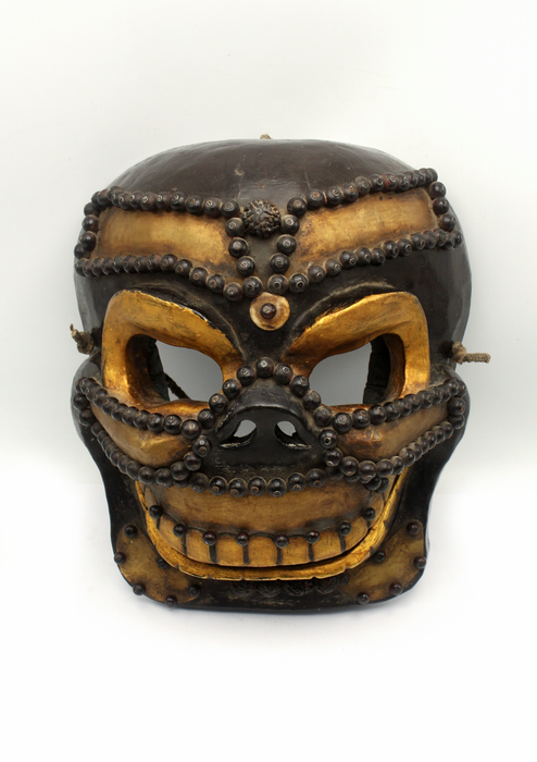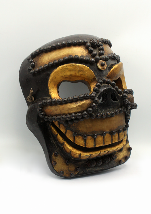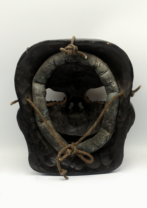 This wooden yellow skull mask, with its rustic finish and hauntingly detailed features, embodies a striking blend of traditional craftsmanship and symbolic depth. The bold, skeletal design serves as a powerful reminder of impermanence and the transient nature of life, making it a compelling piece for any collection or sacred space.