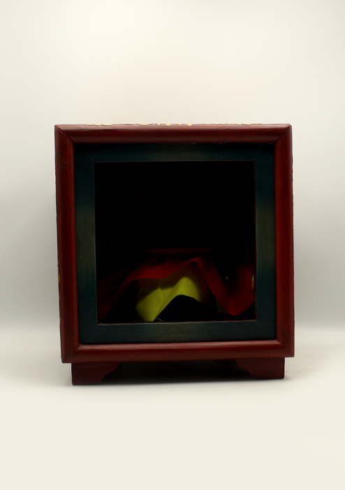 This exquisite square box is designed to hold the sacred treasure vase bhumpa, making it a cherished item for practitioners. Adorned with double dorje symbols at the pinnacle of its design, it exudes an aura of spiritual significance. The sides and back are intricately embellished with the treasure vase motif, symbolizing abundance and prosperity. A transparent glass panel at the front elegantly showcases the bhumpa, adding a touch of reverence to its presentation. This box not only serves as a functional storage unit but also as a decorative piece that resonates with the essence of Tibetan spirituality.