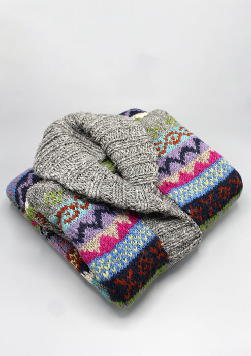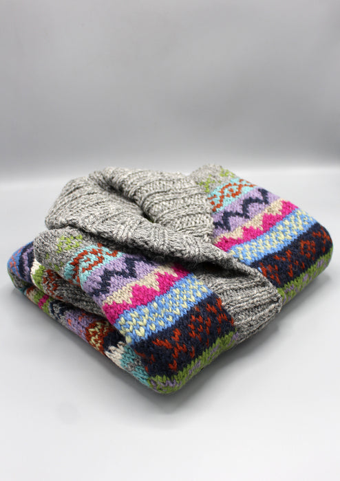 This beautiful woolen cardigan is hand knitted by a Nepalese women in Nepal. Knitting a sweater with multiple woolen threads to make a different patterns require a special talent and practice. Made with love and care, these cardigan is perfect to wear during the coldest seasons of the year to keep yourself warm and cozy.