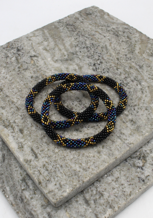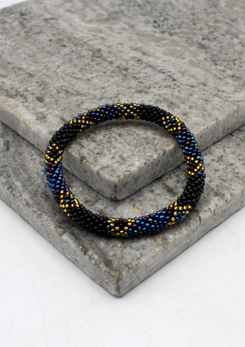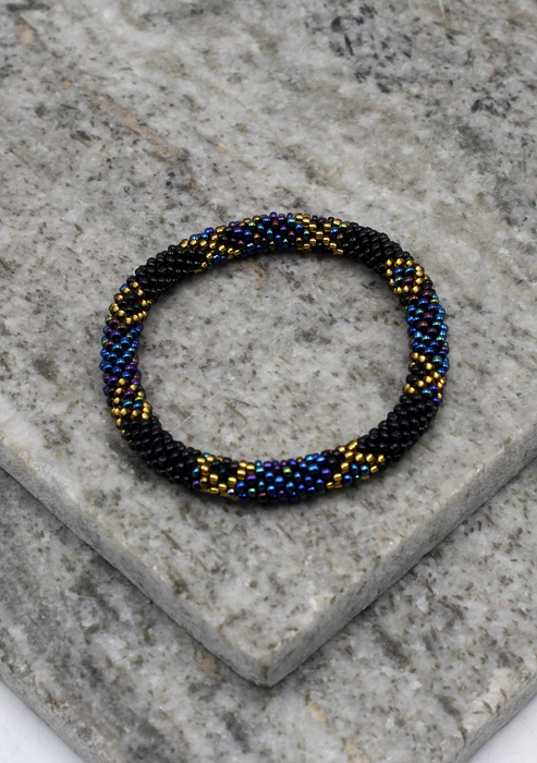 This is a very beautiful and stylish roll on glass beads bracelet handmade in Nepal. Our woman artist carefully hand-strung this fairly traded roll on bracelet. Made with the finest quality Czech and Japanese beads, the bracelet stretches as you roll it over your wrist. It fits most wrists as it is adjustable and will roll over around your wrist.