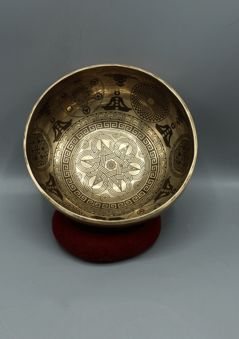 This is a handmade Endless Knot Mandala Itched Gulpa Singing Bowl with Eight Auspicious Symbols. The singing bowl has an endless knot mandala itched on the inside with the eight auspicious symbols itched on the outside of the singing bowl. .