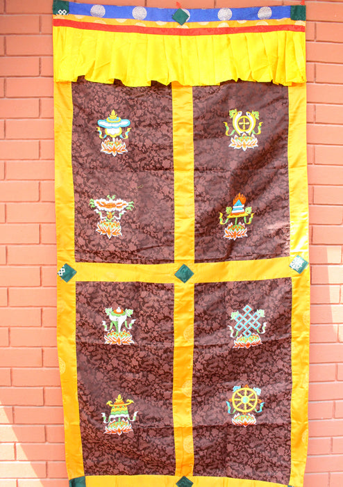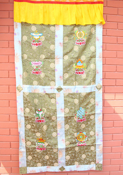 This is a wonderfully embroidered Silk fabric door curtain handmade in Nepal. This door curtain is embroidered with Tibetan eight auspicious symbol which is considered as lucky symbols. These door curtains are of high quality and these kinds of door curtain are specially used in Bhutan by royal families. The border of the door curtain is silk and designed with beautiful flower. The whole door curtain is embroidered with flower along with eight auspicious symbol.