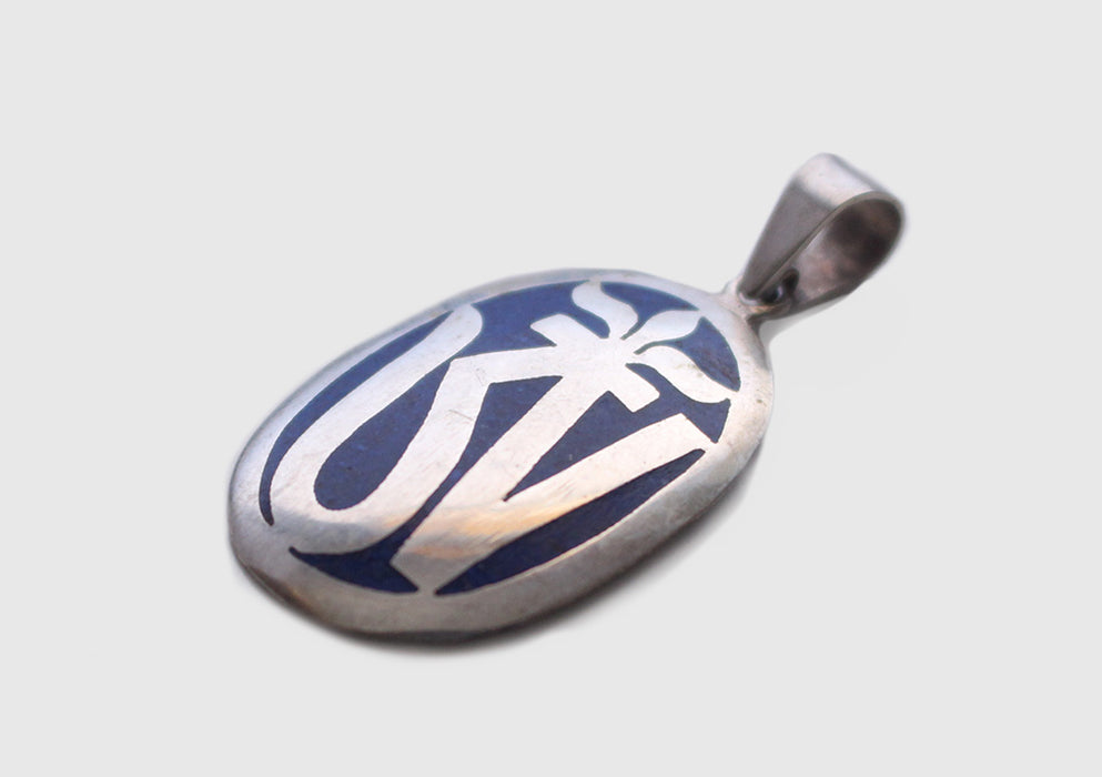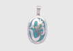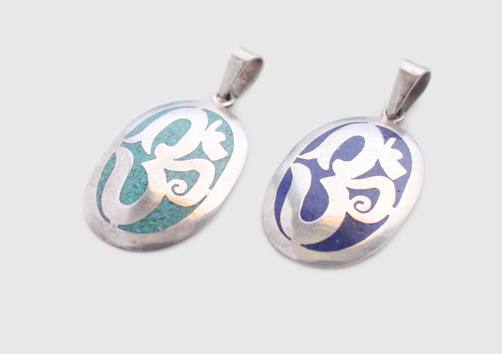 This is a beautiful resin Lapis and Turquoise inlaid oval white metal pendant with silver plating. This pendant has high ritual sentiment and popular in the Buddhist culture. The pendant has Tibetan Om and Hindu Om.