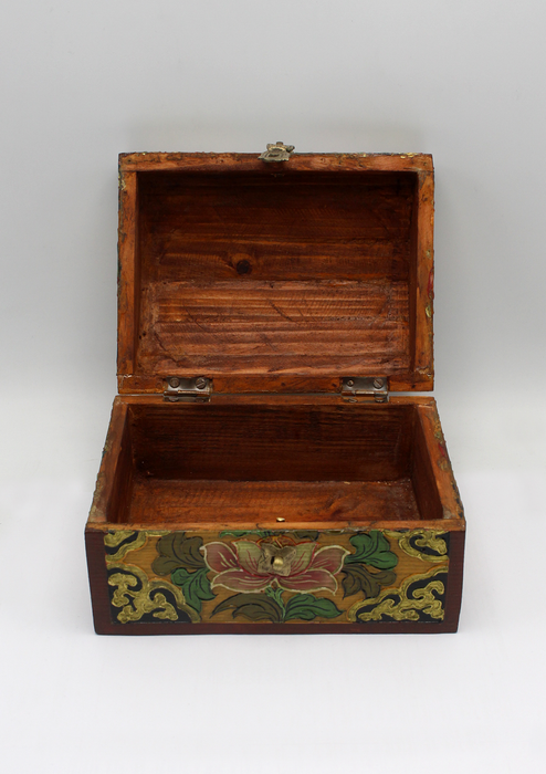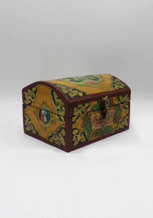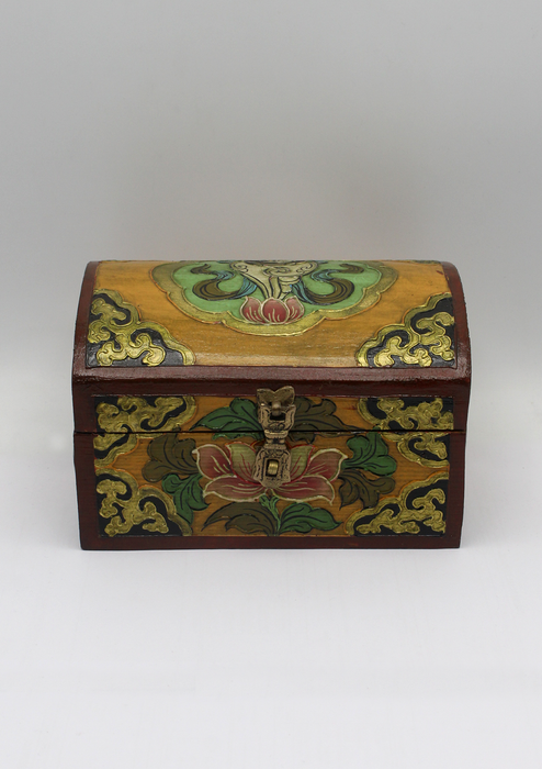 The vibrant colors, auspicious symbols of Tibetan Buddhism, beautiful designs and detailed paint-work makes this box special and decorative. You can use this box to put your jewelry, keys, small sized valuable items and can also be used as a decorative piece. These boxes are trending as home décor these days and are in a lot of demand. These are favored by the tourist visiting Nepal and are collected as art and decorative pieces; these are also popular and hot items to be presented as gifts to your near and dear ones.