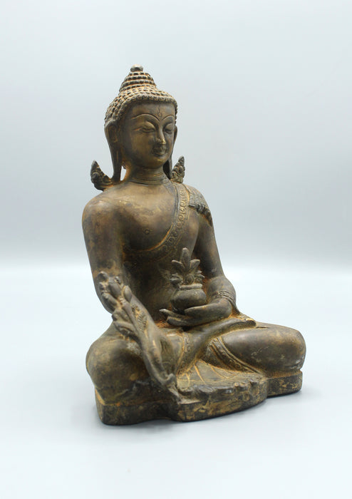 Medicine Buddha is seated on a lotus as platform, holds a vase in his left hand and is meditating calmly. The fine details of the statue brings added beauty to the statue.