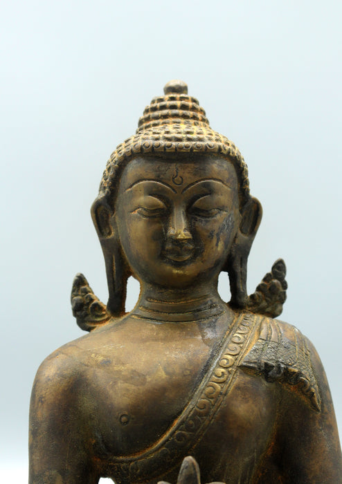 This is a 8.5 inch high bronze statue of Medicine Buddha. The statue has a wooden base and artist has given it an exclusively antique look.
