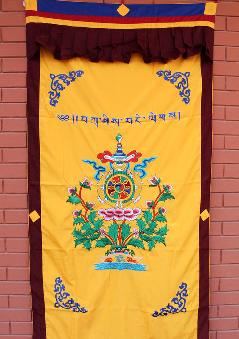 This door curtain has a beautiful border. The door curtain is embroidered with Tibetan eight auspicious symbol.