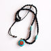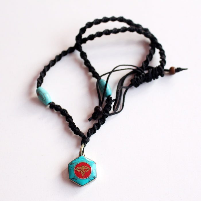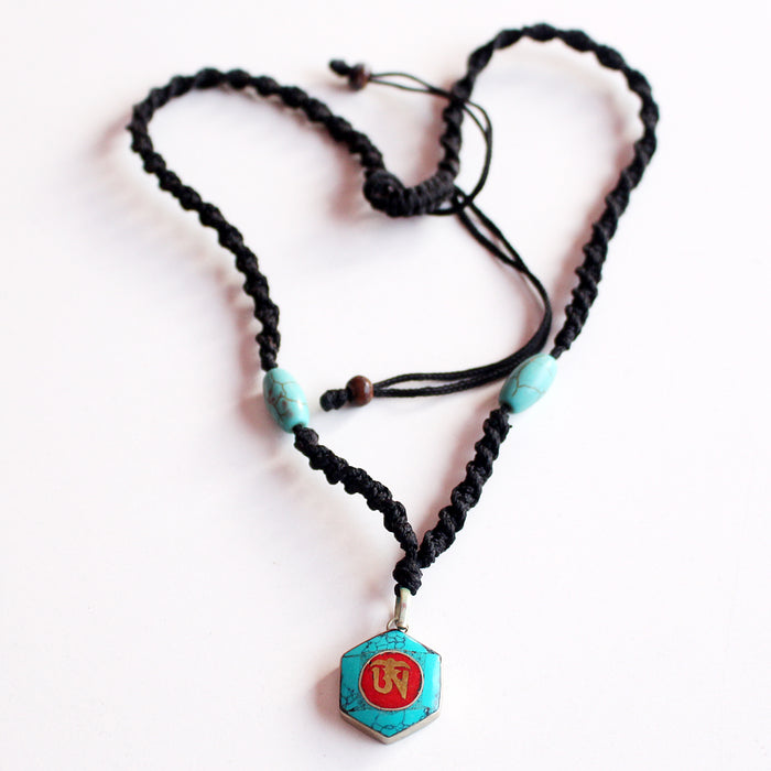 This is a beautiful faux Coral and Turquoise inlaid hexagonal Tibetan Om pendant. This pendant is made of white metal & has high ritual sentiment and popular in the Buddhist culture. This pendant features a durable woven nylon thread with two oval spacers.