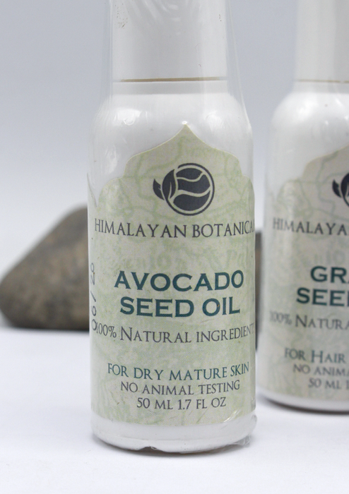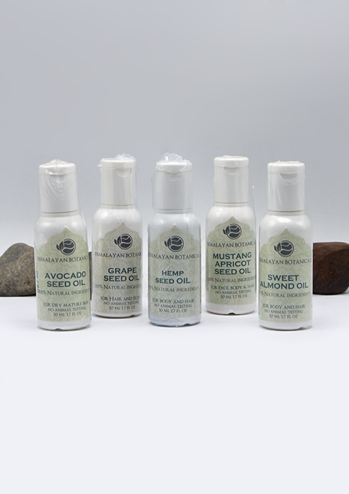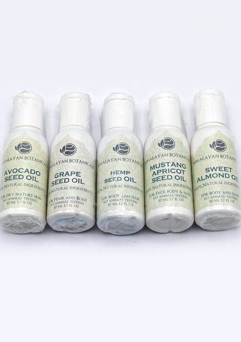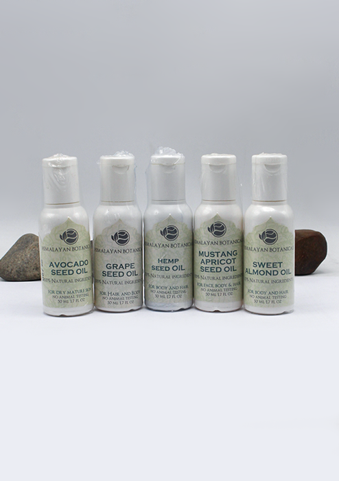 This Himalayan Botanicals oil set features Avocado, Grape Seed, Hemp Seed, Mustang Apricot Seed, and Sweet Almond oils. Each bottle is crafted with natural ingredients and is suitable for hair, body, or face, offering nourishment and hydration for various skin and hair care needs.