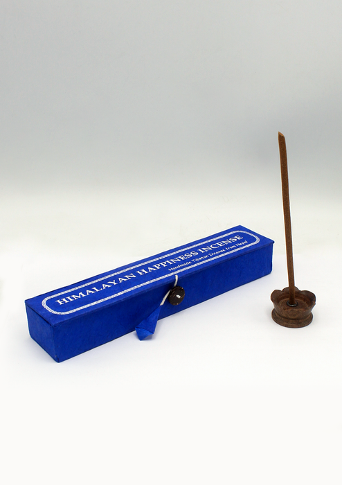 It comes in an elegant blue box and is fastened by wrapping a rope around a button for secure closure, featuring a set of long incense sticks and a small, flower-shaped incense holder.