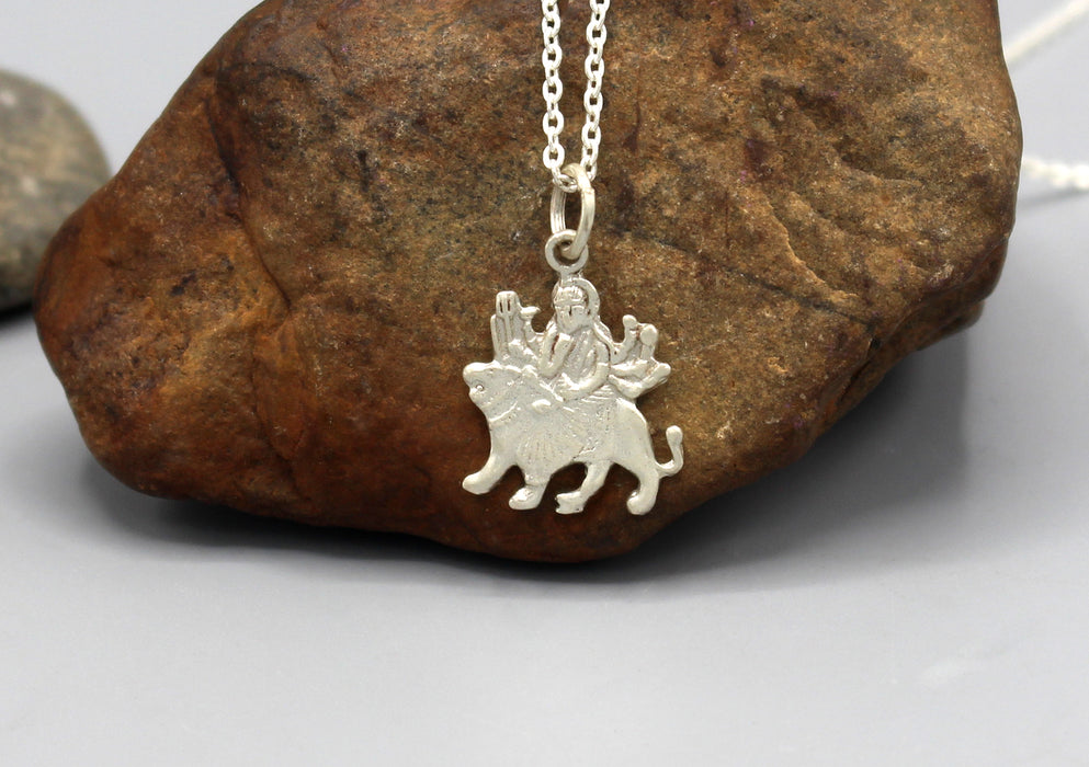 This beautiful pendant is made of Sterling silver. It is lightweight and unique. The fine carving of Hindu Goddess Durga is done in a pendant. She is identified as Adi Parashakti, is a principal and popular form of Hindu Goddess. She is the warrior goddess, whose mythology centers around combating evils and demonic forces that threaten peace, prosperity and dharma of the good.