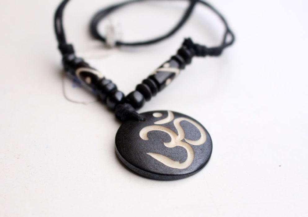 This is a very beautifully hand carved Water Buffolo Bone necklace which features a bone pendant with Hindu power mantra OM. Om is the most powerful mantra in the Hindu beliefs and is associated with Lord Shiva.