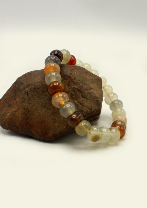This bracelet showcases polished jade beads, known for their natural beauty, cultural significance, and believed healing properties, but in lighter and more translucent colors. The beads feature shades of white, pale yellow, light brown, and occasional hints of red. Irregularly shaped, the beads contribute to the bracelet's natural aesthetic.