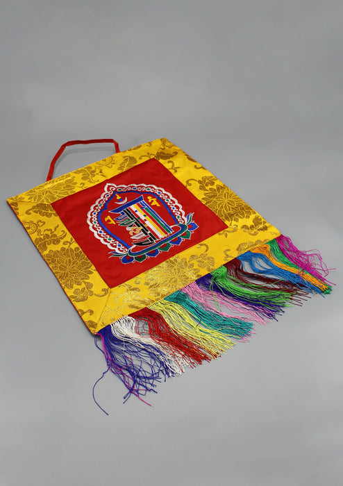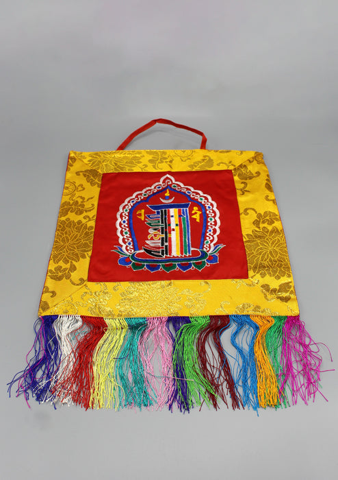 This is a beautiful banner with the Kalachakra Symbol Embroidery. This beautiful wall hanging banner has been framed with the nice quality Hongkong Silk Brocade along the sides. This banner has 5 inch long fringes which waves gently below the main banner.