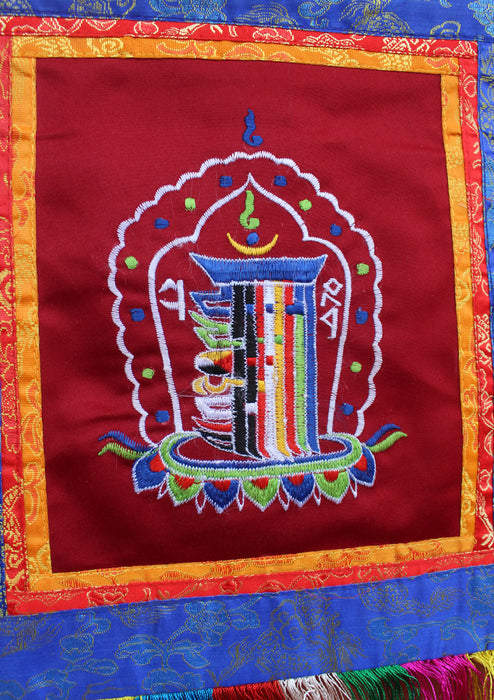 This is a beautiful banner with the Kalachakra Symbol Embroidery work. This beautiful wall hanging banner has been framed with the nice quality Brocade along the sides. This banner has 5 inch long fringes which waves gently below the main banner.