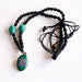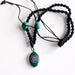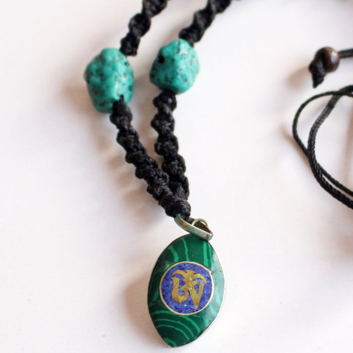 This is a beautiful faux lapis inlaid Tibetan Om pendant. Handcrafted in a traditional way in Kathmandu, Nepal, this pendant features a durable woven nylon thread with two turquoise spacers.