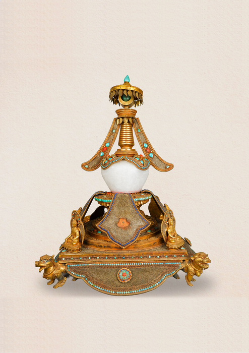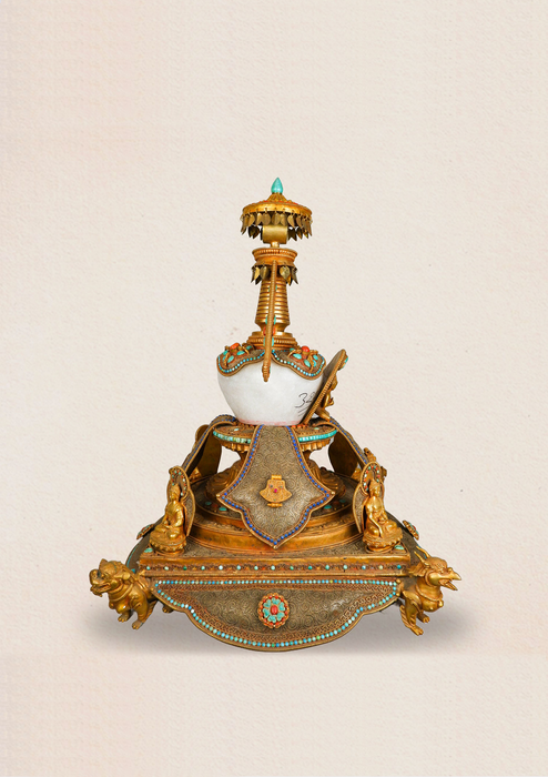 Lionhearted Illumination Five Buddha Stupa with Crystal Bowl and Turquoise Adornments on Majestic Lions