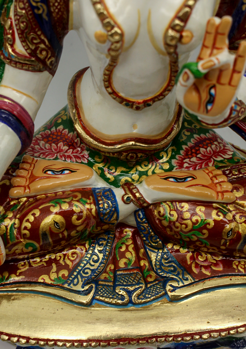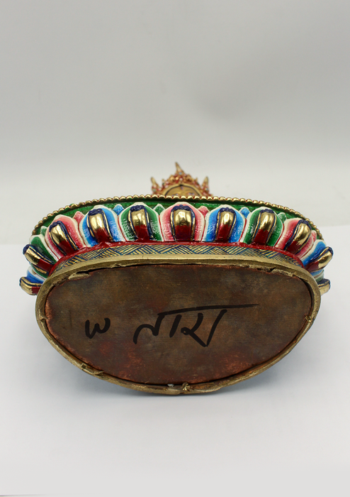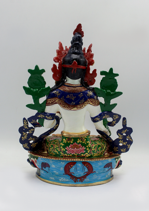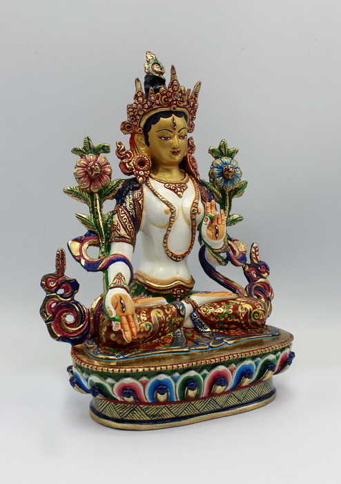 This is a Statue of White Tara, the goddess of compassion. Her love heals at the source of disease, bringing health, strength, longevity and beauty. The work on this statue is delicate and very fine. It is made with a lot of hard work and comes out very clean. Our artist Meenu Shakya completed the whole painting of the statue. She has used the embossed painting style which looks amazing. The statue is glowing with colors. The face of White Tara is gold painted.