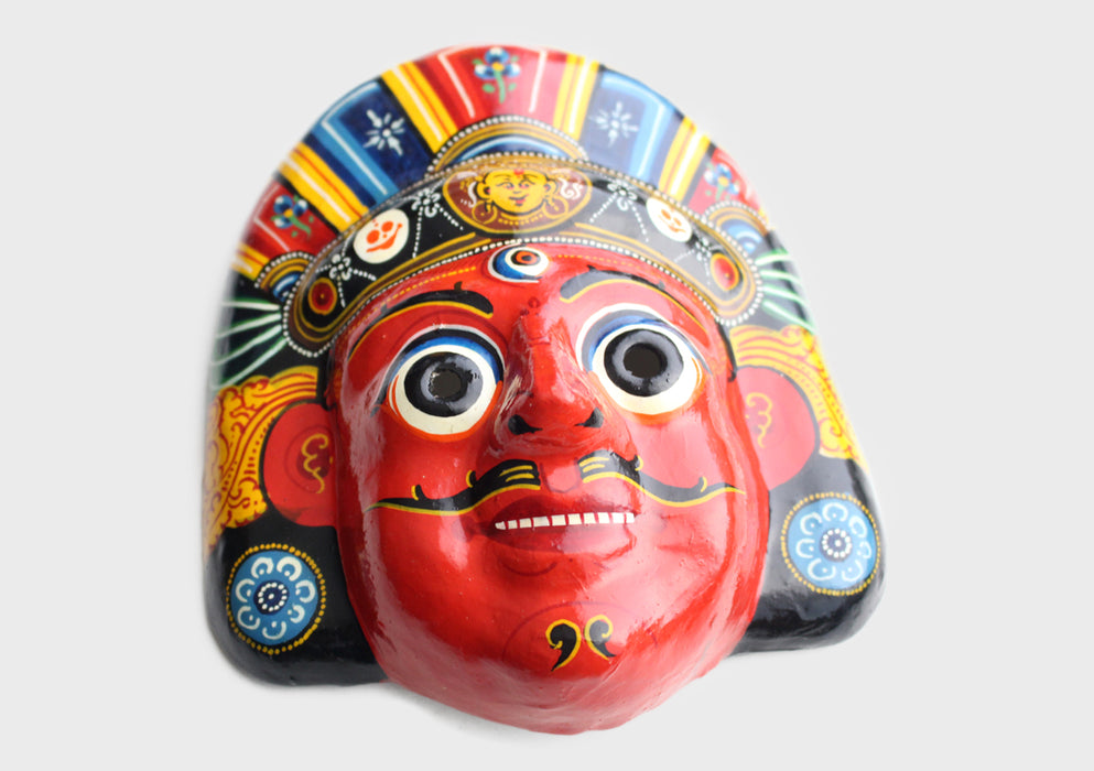 This is a unique mask made of paper. The mask is given a shape of Mahakala and hand painted with different colors. The hard paper is used to make this wonderful mask. The decoration in the crown of the Mahakala is the main attraction of this mask.