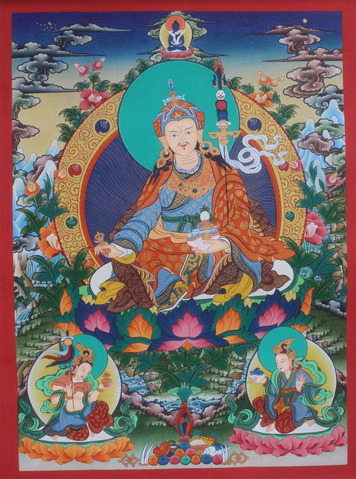 A majestic thangka painting of Guru Rinpoche depicts him as the central figure along with Buddha consort at the top and two dharmapalas at the bottom corners. Guru Rinpoche also known as Padmasambhava is the most powerful apostle of tantricism and very eminent saint in the spiritual lineage of Nyingmapa order of Tibetan Buddhism of which he was the founder.