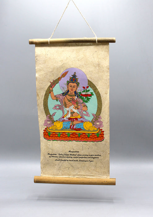 This is a beautiful wall hanging handmade in Nepal. The bright and colorful picture of Manjushree is printed in the Himalayan lokta paper. To give it a traditional and Nepalese look, Bamboo sticks are attached to both side of the wall hanging. Bamboo sticks also balance and hold the paper perfectly.